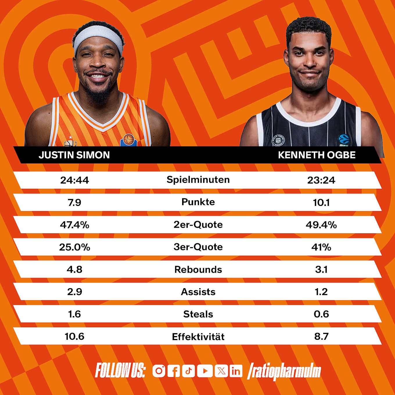 Im Duell zwischen Justin Simon und Kenneth Ogbe prallen zwei unterschiedliche Spielertypen aufeinander. Simon überzeugt vor allem durch seine Vielseitigkeit, seine defensive Präsenz und seine Fähigkeit, das Spiel in mehreren Bereichen zu beeinflussen. Ogbe bringt dagegen viel Gefahr aus der Distanz mit und kann mit seinem Wurf jederzeit für wichtige Impulse sorgen. Entscheidend wird sein, wer dem Spiel seinen Stempel aufdrücken und seinem Team damit den größeren Mehrwert liefern kann.