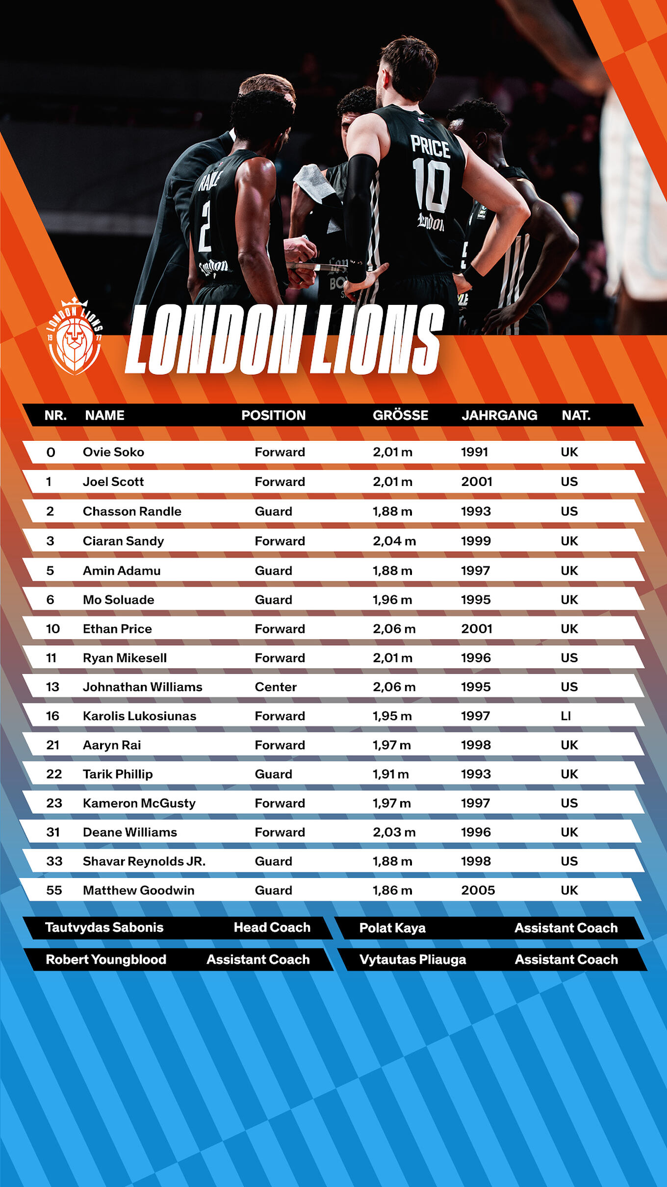 Nach einem Jahr Abwesenheit stellt die britische Hauptstadt London wieder eine Mannschaft im EuroCup. Seit dieser Saison steht mit Tautvydas Sabonis ein bekannter Name an der Seitenlinie der Lions. Der Bruder des NBA-Stars Domantas Sabonis bringt als langjähriger Assistenztrainer des EuroLeague-Vertreters Zalgiris Kaunas viel internationale Erfahrung in die Hauptstadt mit. Erfahrung ist auch im Kader das passende Stichwort: Ein Großteil der Mannschaft sammelte bereits reichlich Spielzeit im europäischen Basketball. Mit Deane Williams, Joel Scott und Ryan Mikesell stehen gleich drei ehemalige BBL-Akteure im Aufgebot der Engländer. Letzterer spielte zuletzt eine überragende Saison in Heidelberg, ist aktuell jedoch vom Verletzungspech geplagt. Forward Kameron McGusty (15,6 Punkte) und Spielgestalter Tarik Phillip (10,0) gelten derzeit als tragende Säulen des Teams.