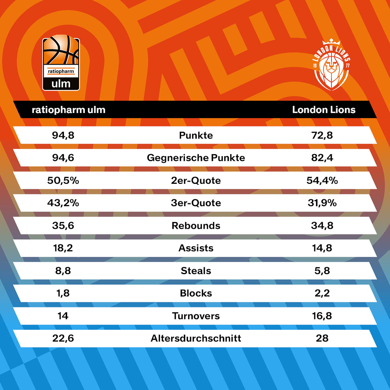 Die zweitstärkste Offensive des Wettbewerbs trifft auf die defensivgeprägten Hauptstädter: Ulm stellt mit durchschnittlich 94,8 Punkten eine echte Offensivgewalt im internationalen Wettbewerb. London hingegen legt den Fokus deutlich stärker auf die Verteidigung. Offensiv erzielen die Lions mit 72,8 Punkten pro Partie über 20 Zähler weniger als die Mannschaft aus der Doppelstadt. Am defensiven Ende kassieren sie jedoch mit 82,4 Punkten knapp zwölf Zähler weniger als die Uuulmer.