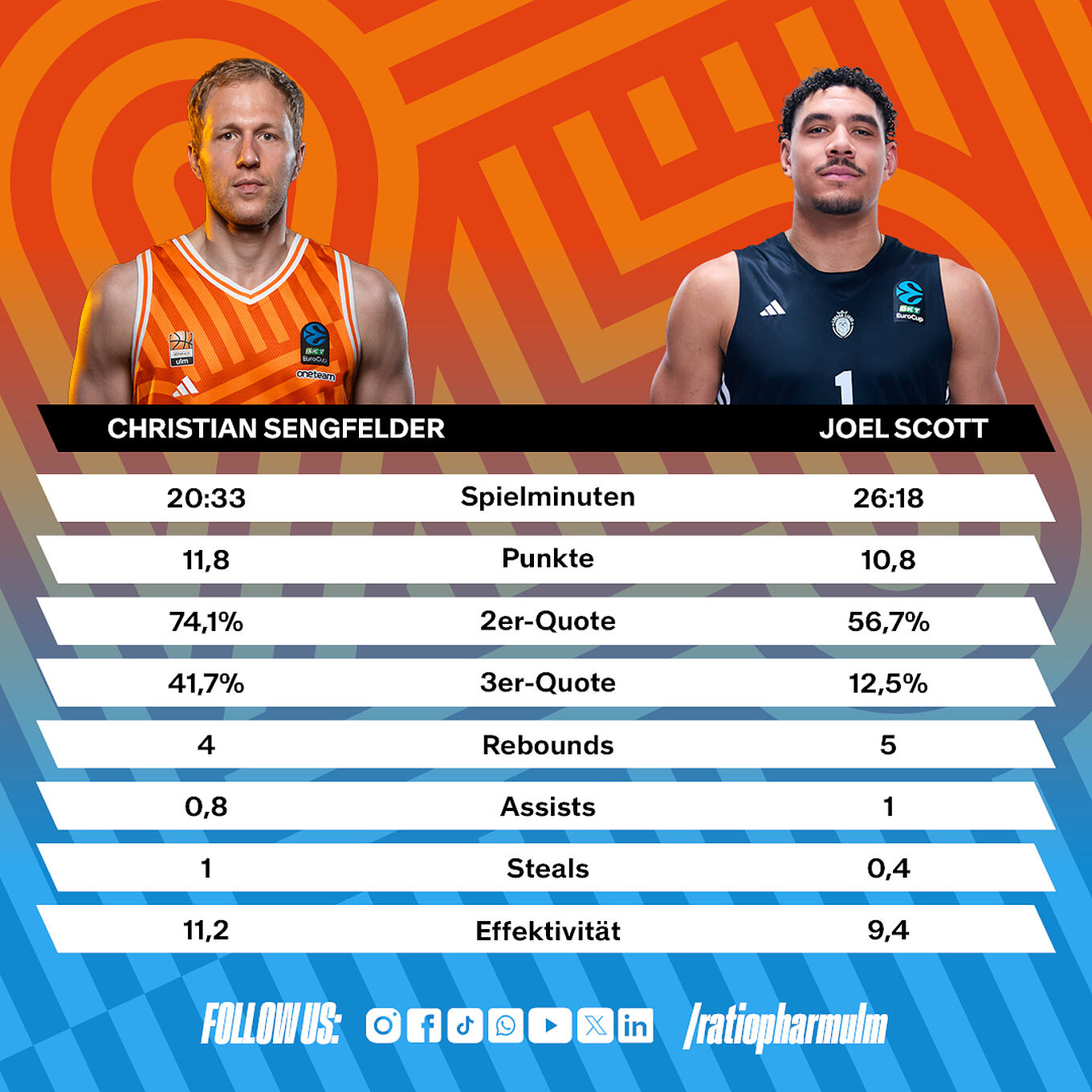 | 1 | 43 | Christian Sengfelder | 20:45 | 11.50 | 18 | 22 | 81.8 | 6 | 17 | 35.3 | 24 | 39 | 61.5 | 15 | 17 | 88.2 | 2.70 | 2.00 | 4.70 | 1.30 | 0.20 | 1.00 | 0.00 | 2.20 | 13.80 | 1 |