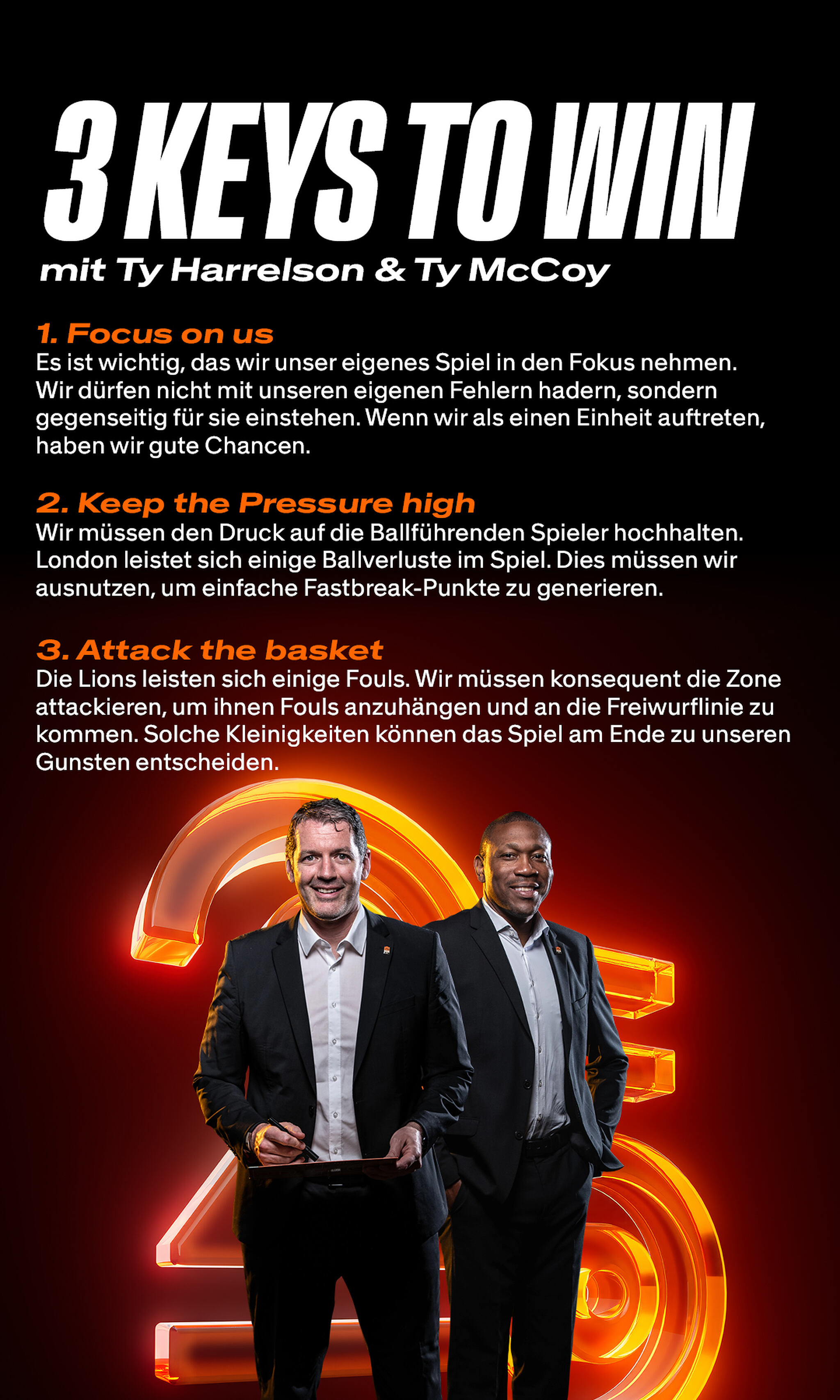 Head Coach Ty Harrelson: „Es ist immer schön, zu Hause spielen zu dürfen. Am Samstag konnten wir unseren Fans nicht das bieten, was sie verdient hätten. Wir wollen dem Publikum Dankbarkeit zeigen und sie mit unserer Art Basketball zu spielen überzeugen. Wir müssen uns auf unser eigenes Spiel fokussieren. London ist mittlerweile im Wettbewerb angekommen, aber zuletzt haben wir uns mit unseren eigenen Fehlern selbst geschlagen. Ich bin zuversichtlich, dass wir zu unserem alten Fokus zurückfinden.“