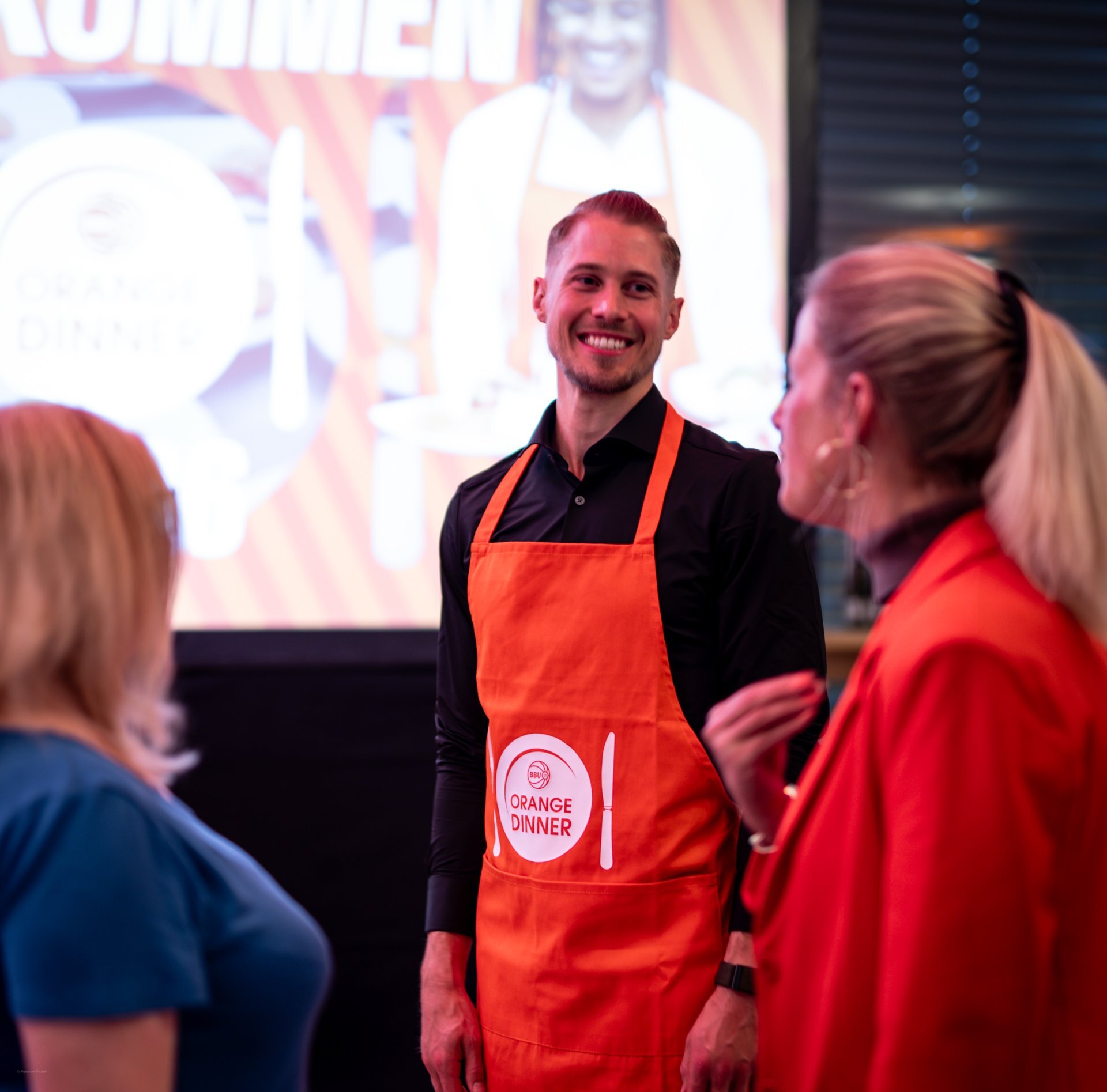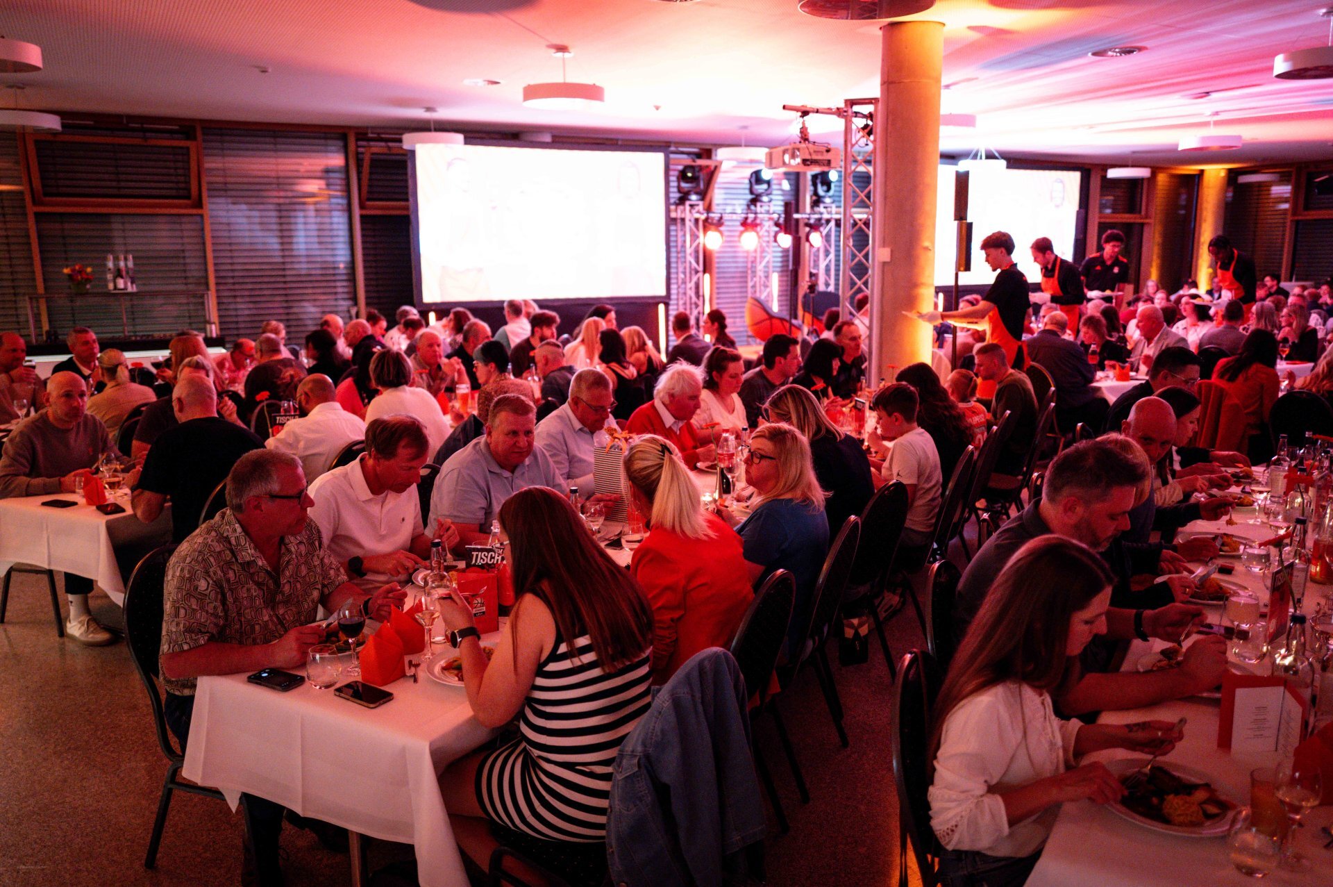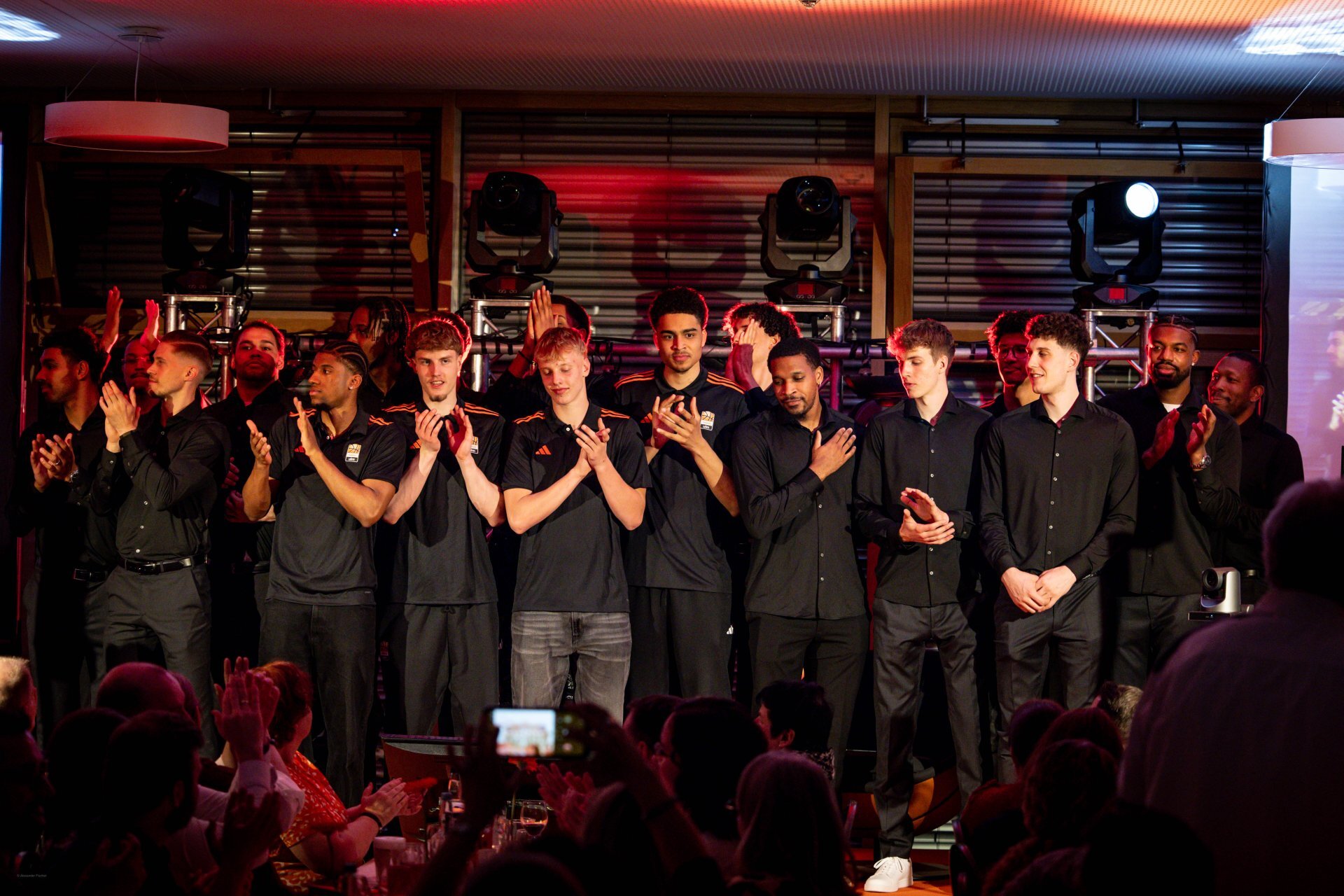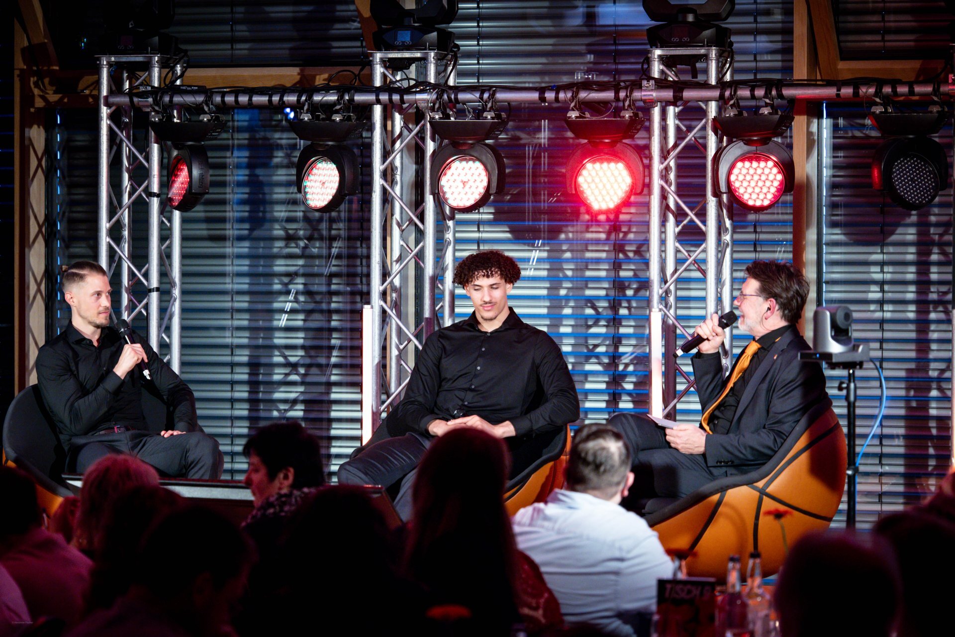 Schon der Auftakt des Abends hatte diese besondere Mischung: ein stilvolles Drei-Gänge-Menü, begleitet von Humor und Nähe zu den Uuulmer Spielern. Während das Brotkörbchen die Runde machte, wurde auf der Bühne bereits gelacht. Marc scherzte, dass Chris Ledlums Weg zum Tisch langsamer aussehe als sein Zug zum Korb“ und sorgte für die ersten Lacher des Abends. Auch Teo, der jüngste unten den Uuulmer Profis, bekam sein Fett weg, augenzwinkernd wurde angemerkt, man müsse sich beeilen, „damit er noch rechtzeitig ins Bett kommt.“ Zwischen Vorspeise und ersten Gesprächen zeigte sich: Selbst beim Servieren glänzten die Uuulmer. Nelson Weidemann, Tommy Klepeisz und Chris Sengfelder trugen mühelos drei Teller gleichzeitig.