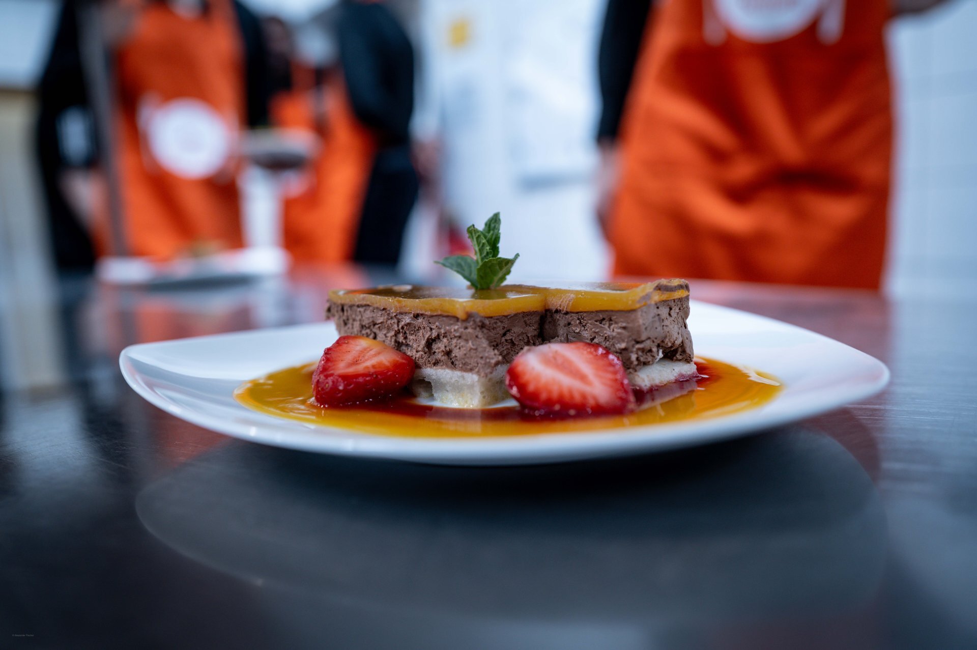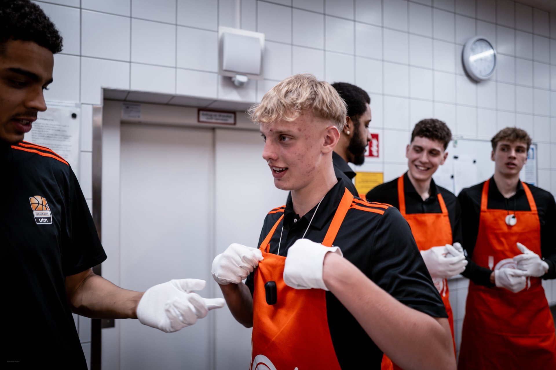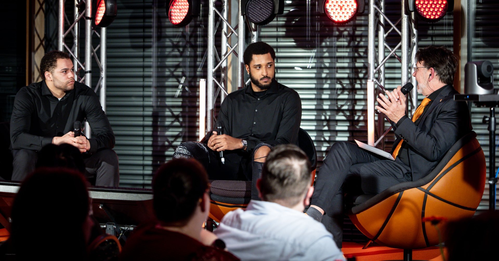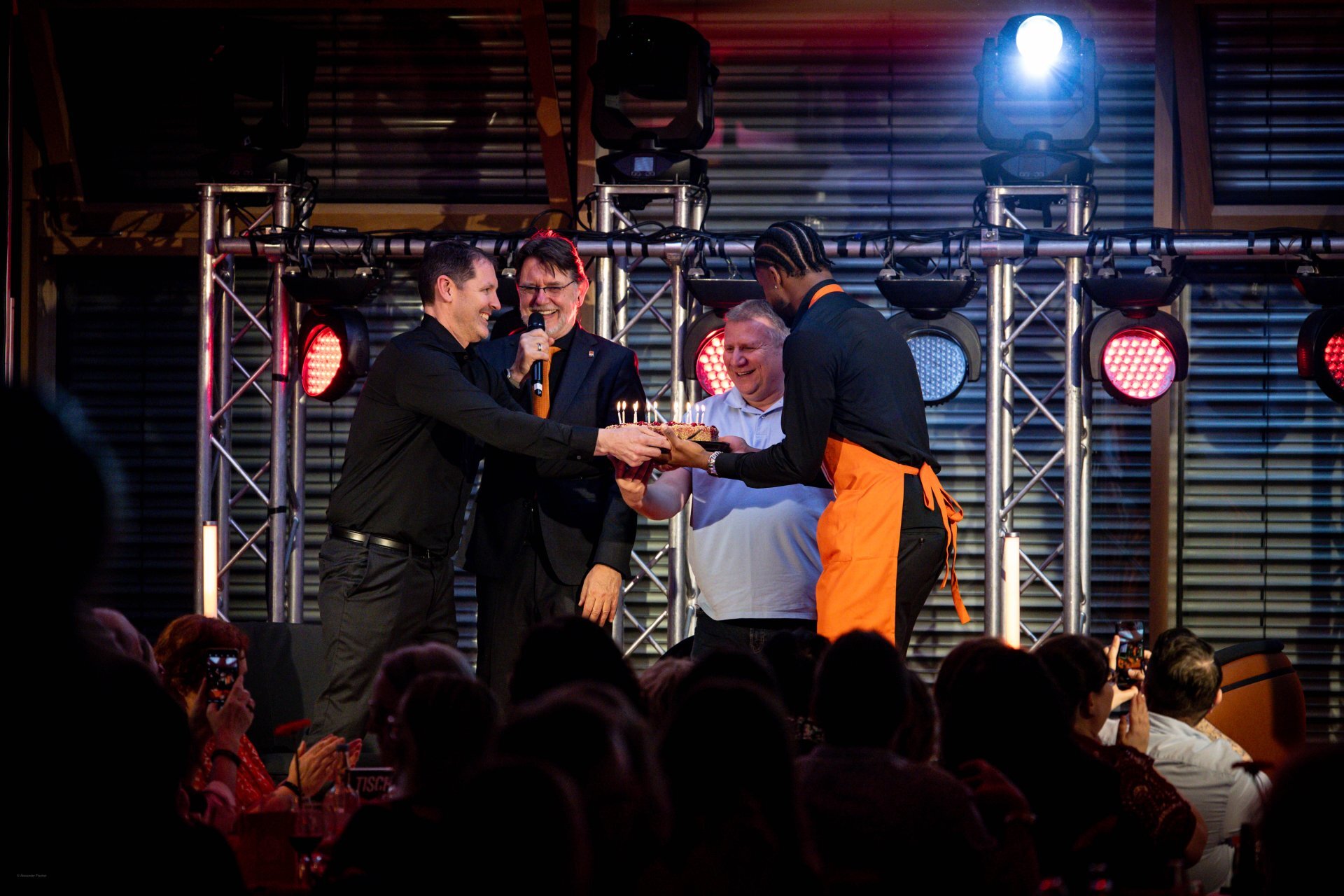 Schon der Auftakt des Abends hatte diese besondere Mischung: ein stilvolles Drei-Gänge-Menü, begleitet von Humor und Nähe zu den Uuulmer Spielern. Während das Brotkörbchen die Runde machte, wurde auf der Bühne bereits gelacht. Marc scherzte, dass Chris Ledlums Weg zum Tisch langsamer aussehe als sein Zug zum Korb“ und sorgte für die ersten Lacher des Abends. Auch Teo, der jüngste unten den Uuulmer Profis, bekam sein Fett weg, augenzwinkernd wurde angemerkt, man müsse sich beeilen, „damit er noch rechtzeitig ins Bett kommt.“ Zwischen Vorspeise und ersten Gesprächen zeigte sich: Selbst beim Servieren glänzten die Uuulmer. Nelson Weidemann, Tommy Klepeisz und Chris Sengfelder trugen mühelos drei Teller gleichzeitig.