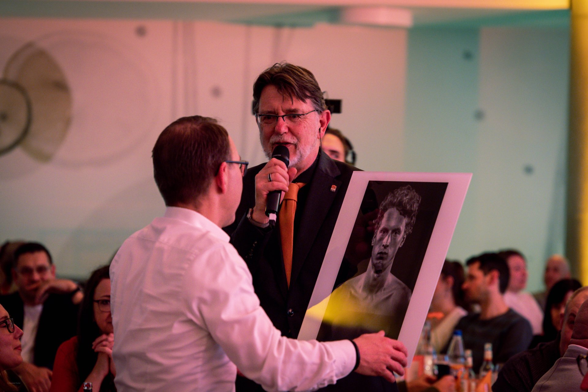 Mit dem Start der Tombola rückte der Charity-Aspekt des Abends in den Mittelpunkt. Im Zeichen des guten Zwecks wurden besondere Einzelstücke versteigert, darunter signierte Nationaltrikots von Nelson Weidemann und Chris Sengfelder sowie individuelle Erinnerungsstücke wie ein besonderes Bild von Per Günther, das der Ersteigerer im Anschluss persönlich mit einer gewünschten Widmung versehen lassen darf. Auch Ben Sarraf stellte eines seiner signierten Trikots für die Versteigerung zur Verfügung. Der gesamte Reinerlös der Tombola kommt der Nachwuchsarbeit zugute und macht die Aktion damit zu einem zentralen Bestandteil des gelebten Charity-Gedankens des Abends. Ein weiteres Highlight: Per Günther selbst meldete sich per Videocall vom Hamburger Bahnhof zu Wort und nahm die Gäste mit auf eine kurze Reise in die Vergangenheit. Besonders die Erinnerungen an die alte Trainingsstätte „Raz“ bewegten. „Ein Ort der Freiheit“, beschrieb er die Halle, in der während der Corona-Zeit auch persönliche Momente entstanden.