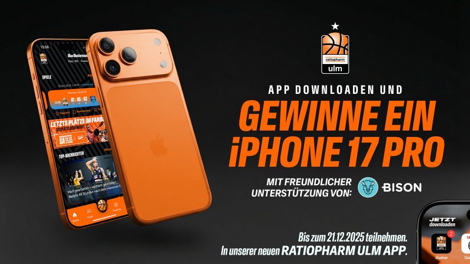 Das Gewinnspiel zu unserem ratiopharm ulm App-Launch wird präsentiert von Bison. Dank ihrer Unterstützung können wir einen besonderen Preis verlosen: ein brandneues iPhone 17 Pro, exklusiv für unsere App-Community. Mit Bison haben wir einen Presenter an unserer Seite, der für digitale Innovation, Verlässlichkeit und hochwertige Lösungen steht. Umso mehr freuen wir uns, diesen spannenden Moment gemeinsam zu gestalten und euch zum Start der App ein echtes Highlight bieten zu können. Auch im Januar haben wir gemeinsam mit Bison noch etwas vorbereitet, auf das ihr euch freuen könnt. Vielen Dank an Bison für die großartige Unterstützung und das Vertrauen in unsere Zusammenarbeit.