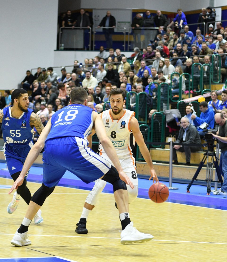 Gruppen-Platz drei sichern, Ra’Shad James Integration ins Team vorantreiben und wenn möglich noch einige Körner Energie sparen: Das waren die drei großen Ziele vor dem letzten EuroCup-Auswärtsspiel in Frankfurt gewesen. Zumindest hinter zwei dieser drei Vorhaben konnte ratiopharm ulm am Mittwochabend einen dicken Haken machen. Ohne die vier Ausfälle (Fotu, Reinhardt, Miller, Günther) und mit einer umgebauten Starting Five (James und Ugrai statt Evans und Thompson) musste Ulm bei „einem der physischsten Teams im EuroCup“ (Thorsten Leibenath) lange um jeden Zentimeter ringen, ehe im letzten Viertel (13:26) die Dämme brachen. „Im Schlussviertel haben wir schließlich Lösungen gegen Frankfurts harte Verteidigung gefunden und uns gute Würfe erspielt“, so ein zufriedener Ulmer Head Coach nach dem 68:83-Erfolg. Ausgerechnet Neuzugang James (9 Punkte im 4. Viertel) war es, der die Ulmer Schlussoffensive gemeinsam mit Javonte Green (7) vorantrieb. „Wir wollten in diesem Spiel unbedingt unsere Erfolgssträhne fortsetzen. Ich bin froh, dass ich dazu beitragen konnte und am Ende einige Würfe getroffen habe“, sagte James.